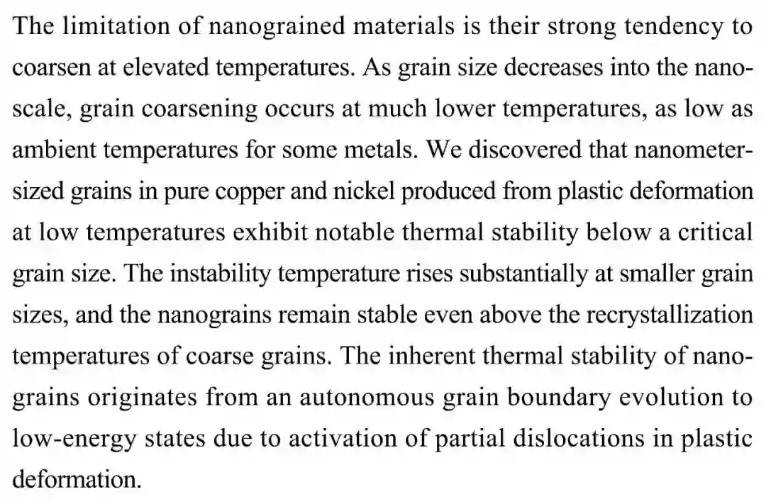 (导读 甜甜)对于某些金属纳米晶粒,晶粒粗化可以在低至环境温度下发生。本研究发现,低温下通过塑性形变产生的纯铜和纯镍中的纳米晶粒在小于一个临界晶粒尺寸时展示出热稳定性。在小晶粒尺寸下,不稳定温度升高,且即使在粗晶粒的再结晶温度以上时纳米晶粒仍能保持稳定。纳米晶粒的固有热稳定性起源于塑性形变中部分位错的激活。