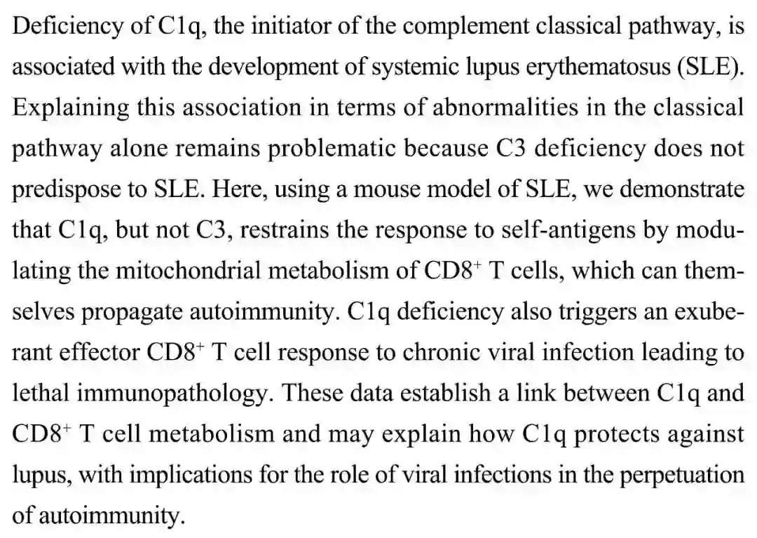 (导读 阿金)补体经典途径始动因子 C1q 的缺乏与系统性红斑狼疮(SLE)有关,但具体机制不明。本研究使用 SLE 的小鼠模型,证明 C1q 通过调节 CD8+ T 细胞的线粒体代谢,抑制对自身抗原的响应,C1q 缺陷还触发效应 CD8+ T 细胞响应慢性病毒感染,导致致命免疫病理反应。研究数据建立起 C1q 和 CD8+ T 细胞之间的联系,为开发靶向药物提供理解基础。