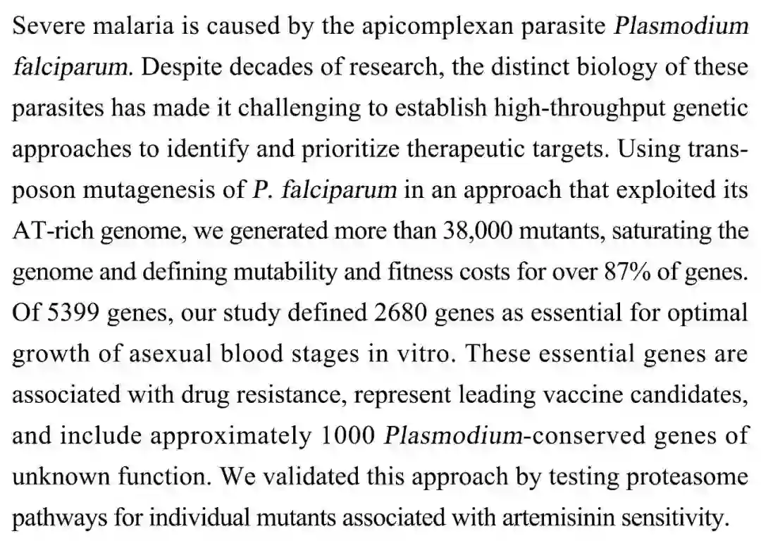 饱和诱变揭示人疟疾寄生虫恶性疟原虫的必需基因