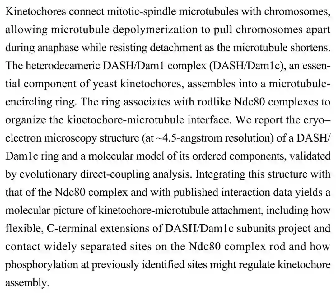 (导读 阿金)着丝点连接有丝分裂纺锤体微管与染色体,而 DASH/Dam1 复合物可组装成一个包围微管的环。本研究报道了分辨率约 4.5 埃的 DASH/Dam1c 环冷冻电镜结构,通过演化直接耦合分析验证其有序组成的分子模型,并将该结构与 Ndc80 复合物和公布的相互作用数据结合,得到着丝点—微管接合的分子图像。