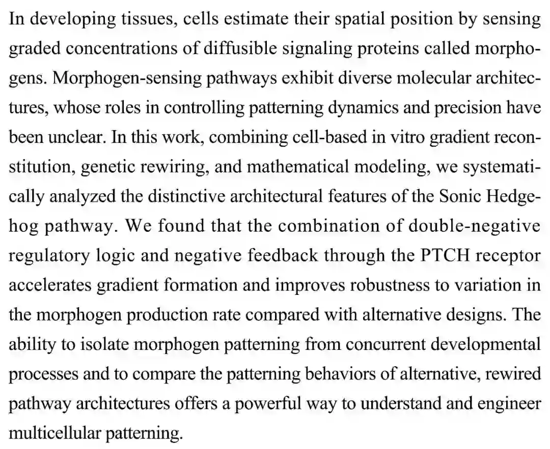 (导读 郭怿暄)在发育的组织中,细胞可通过感知信号蛋白成形素的浓度梯度来估计自身空间位置,但成形素感知通路控制其分布的动态变化和准确度的机制尚不清楚。本研究通过结合体外细胞梯度重建,基因重联和数学建模,系统地对 Sonic Hedgehog 通路的不同构成性特点进行分析。发现结合通过 PTCH 受体双重反向调节逻辑和负反馈可加速梯度建立,改善成形素生成速率变化的稳健性。