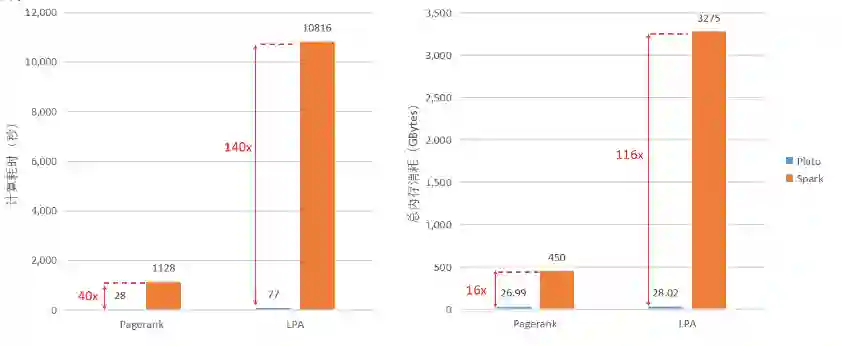 从下图可以看到,Plato 的性能比 Spark GraphX 高出 1-2 个数量级。