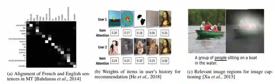如图 4(a) 所示,Bahdanau 等人可视化了注意力权重,这些权重清楚地展示了法语和英语句子的自动对齐,尽管这两种语言中动词和名词的位置不同。