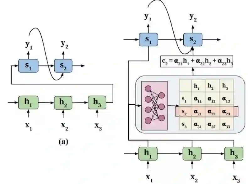 图 2:编码器-解码器架构:(a) 为传统结构,(b) 为带注意力机制的结构。