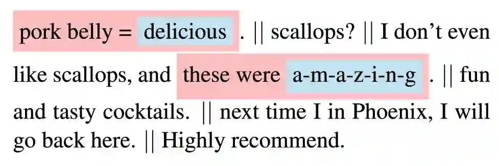 此外,在这些句子中,单词 delicious 和 amazing 在决定评论的情感方面更有意义。