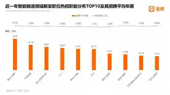 据猎聘大数据显示,智能制造的职位同比增长表现突出,近一年比上一年增长77.45%,几乎是整个生产制造大领域新发职位增速的2倍。且智能制造近一年的招聘平均年薪为23.33万元,比上一年增长17.97%,比生产制造高2.3万元,在薪资上优势明显。