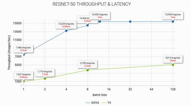 在性能方面,芯片热设计功耗为140W,在ResNet-50上每秒可处理1650张图像,比Nvidia的Tesla V100高出14%,功耗仅为后者的一半。每秒每瓦可处理的图像数量提升了两倍以上。
