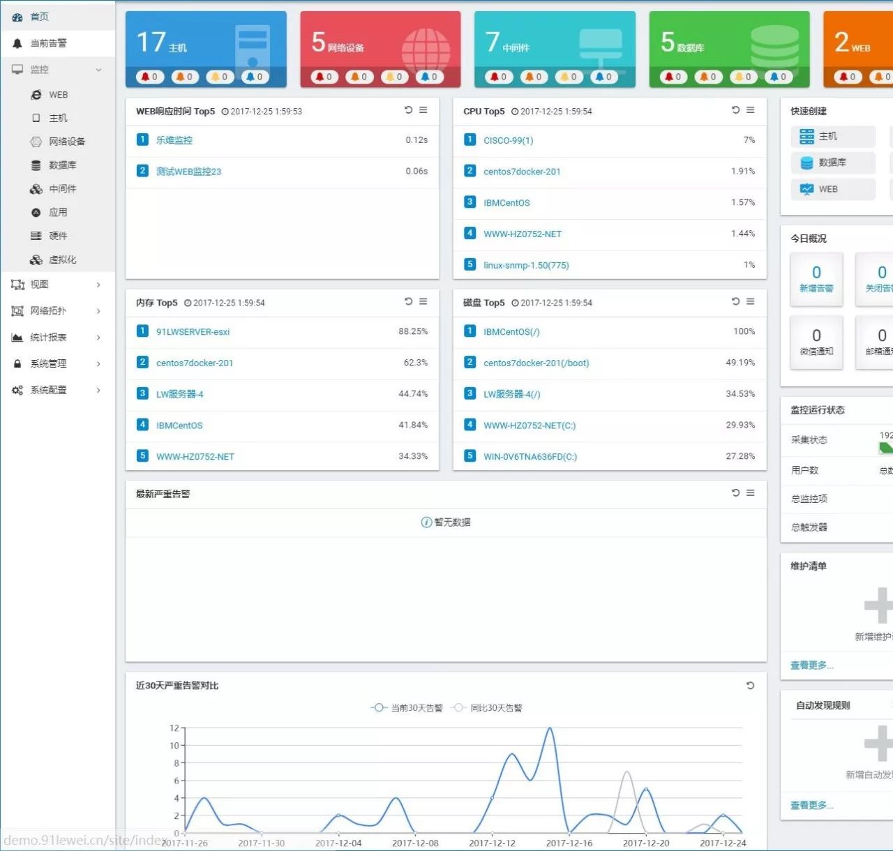 数据采集:可用性和性能检测,自动发现,支持agent、SNMP、JMX、telnet等多种采集方式,支持主动和被动模式数据传输。