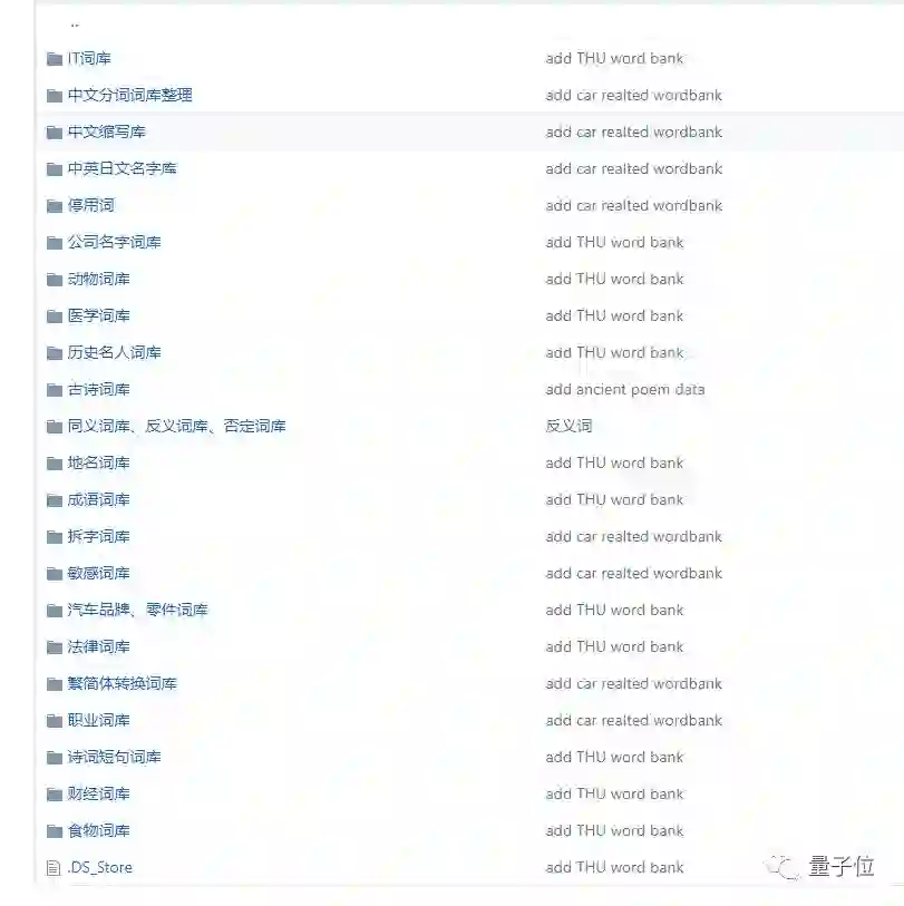 地名词库、历史名人词库、诗词词库、医学词库、饮食词库、法律词库、汽车词库、动物词库、中文聊天语料、中文谣言数据。