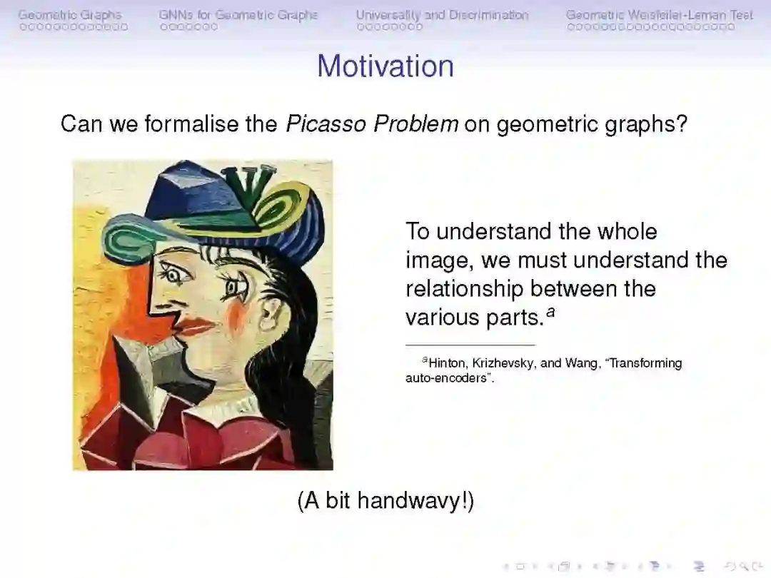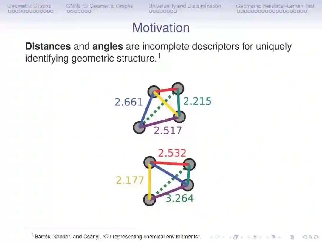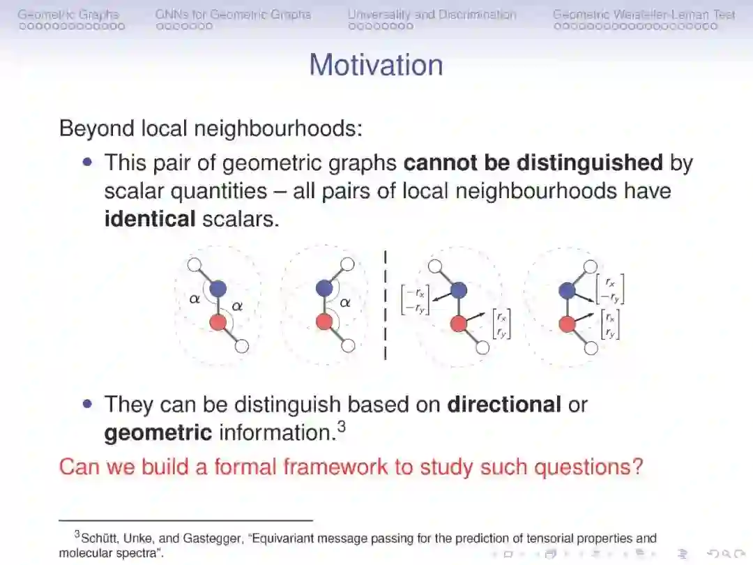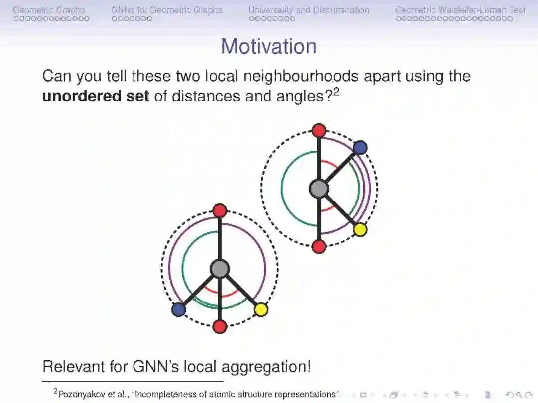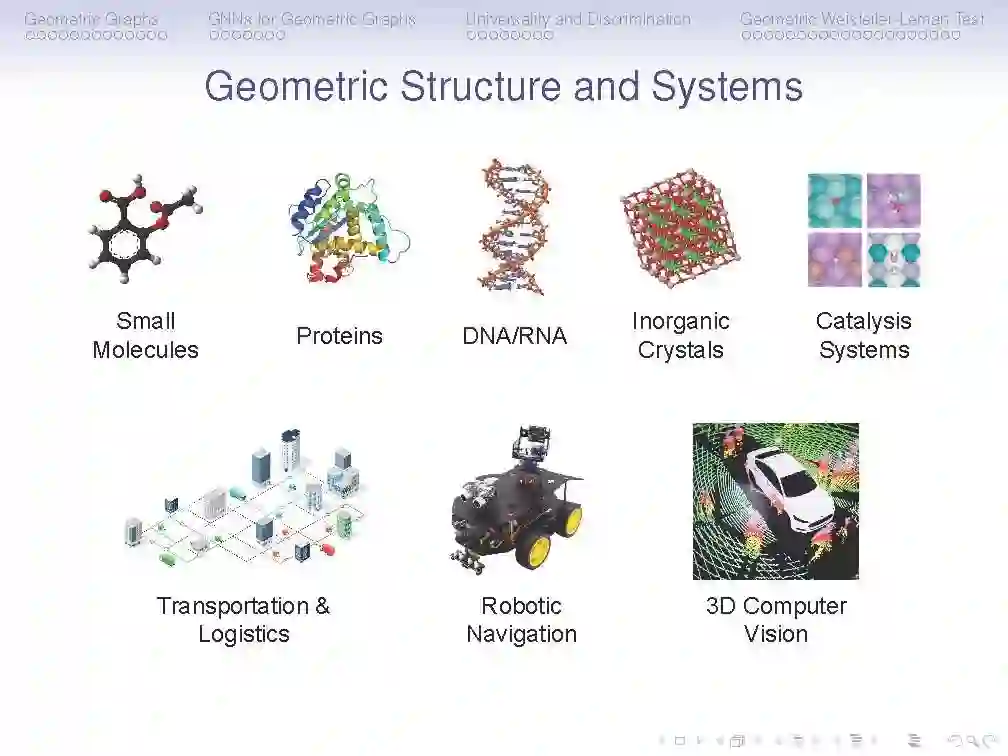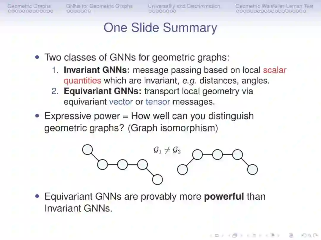 几何图是一种空间嵌入图,用于生物化学、物理模拟和多智能体机器人系统建模。重要的是,图的属性会随着全局欧氏变换或系统的对称性进行变换,例如旋转、反射和平移。具有全局对称性的图神经网络(GNN)已经成为几何图的架构选择。本讲座将介绍两类几何GNNs:(1)等变GNNs,使用全局对称等变的标量和几何特征;(2)不变GNN,它只通过不变标量(如距离和角度)进行局部推理。此外,我们将从区分几何图形的角度研究这两类几何gnn的表达能力,即图同构检验。我们将介绍几何威斯菲勒-勒曼图同构检验(GWL)。然后,我们将使用GWL框架正式表明,等变GNN比不变GNN具有更强的表达能力,因为它们能够传播超越局部邻域的几何信息,并组成构建远程交互。