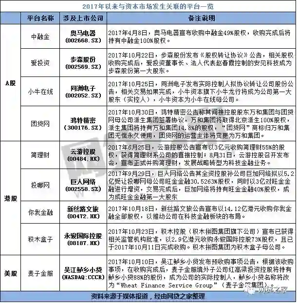 其中,中融金、简理财、你我金融(团贷网兄弟平台)将直接并入上市公司,实现曲线上市;爱投资、小牛在线、积木盒子则属于平台实控人或母公司控股上市公司,后续会否将旗下平台装入上市公司进而实现借壳上市,仍未可知;团贷网母公司则于近期并入上市公司控股公司,后续资本运作尚未可知;麦子金服则有可能通过反向收购,控制一家美股上市公司(目前收购事宜尚未通过)。