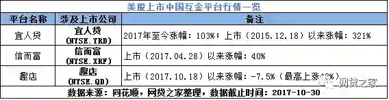 网贷之家在此前的文章中曾提及,中国互金企业正享受着全球金融科技热带来的红利,国外资本市场给出的巨大估值(如趣店)令行业为之振奋,平台对赴美上市趋之若鹜。除了宜人贷、信而富、趣店三家(股价行情表现可参见下表)已成功登陆美股的互金平台之外,和信贷、拍拍贷等平台也已提交IPO申请,将于11月正式登陆美股,其中拍拍贷上市后的估值有望超过50亿美元。
