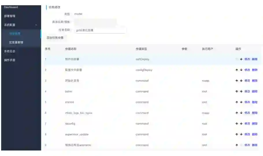 如第一步,部署安装软件;第二步配置文件;第三步初始化等等。根据我们应用的部署类型建立不同的部署需要执行的步骤,按照定义执行步骤能完整地构建起一个应用的运行环境。