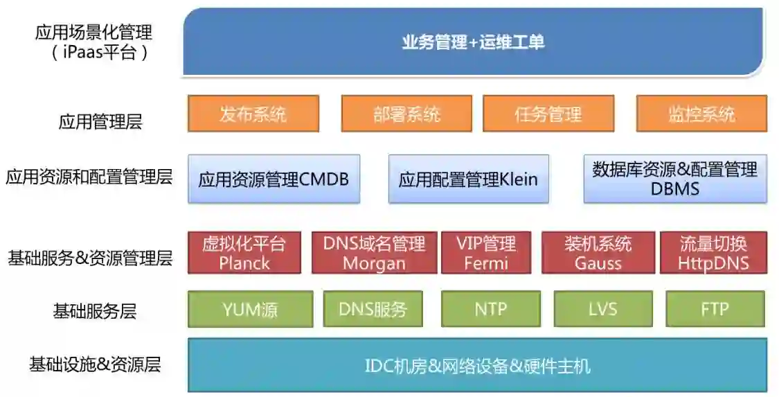 最顶层是开放给业务开发使用的统一运维平台。这些系统并不是说在我们建设当中一下就能建设好的,而是根据我们日常操作当中运维的需要逐步搭建而成。