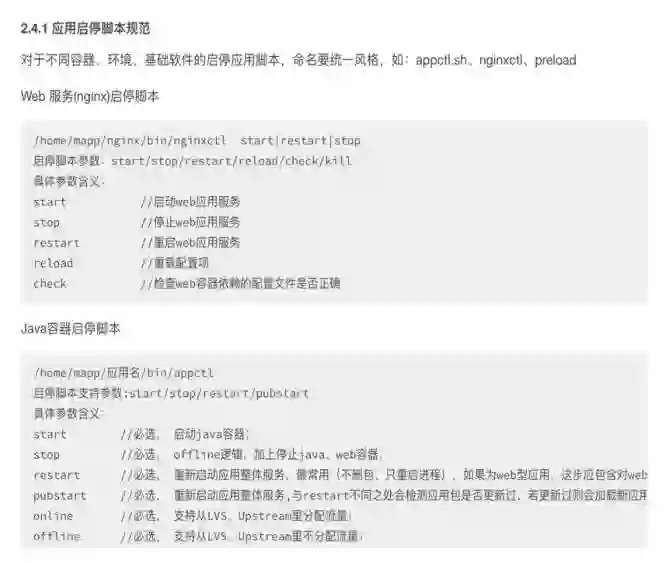 接下来我们还规范了启停脚本,定义了这个脚本里面传的参数,可以支持哪些参数,启动或者重启;每条指令里面做什么事情都进行了说明和规范。