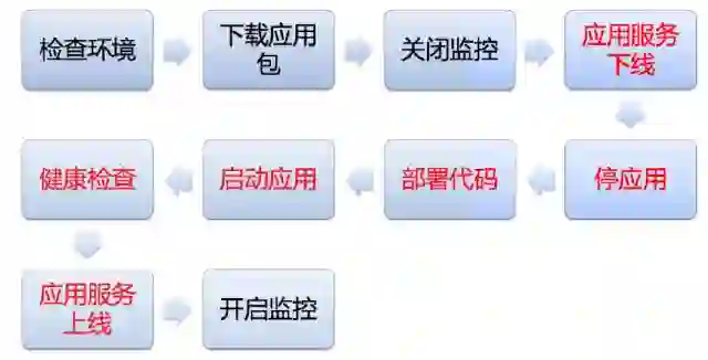 接下来通过监控系统接口关闭相应服务器上监控项;接下来执行应用目录下的应用启停脚本,通知 RPC 调用方或 Web 代理该服务器即将下线。