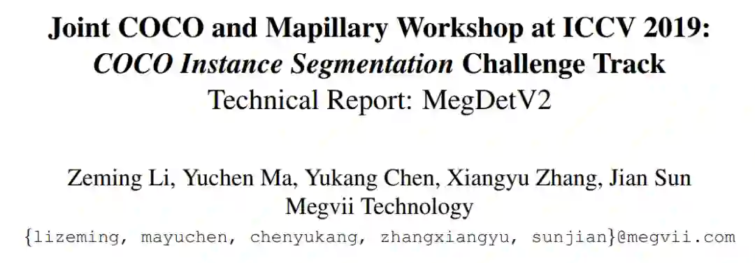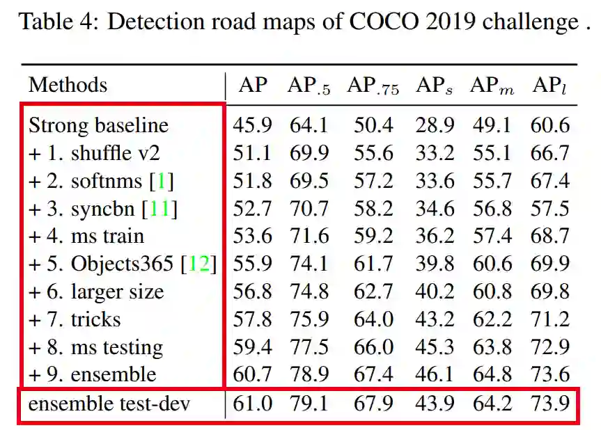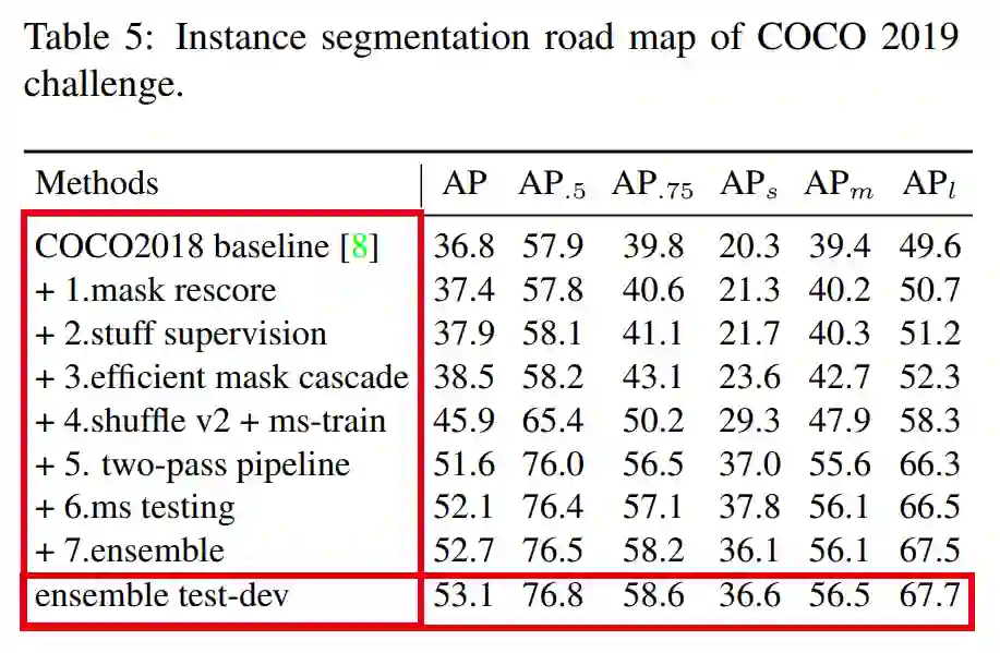 在COCO-2019检测/实例分割 test-dev数据集上,我们的系统达到61.0 / 53.1 mAP,比我们2018年的获胜结果分别高出5.0 / 4.2。