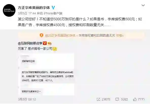 针对这些言论,方正官方微博@方正字库美丽的字体 回应称,“某公司您好!不知道您5000万张印的是什么?如果是书,字库授权费500元;如果是广告,字库授权费4500元,授权费和印刷数量无关”。