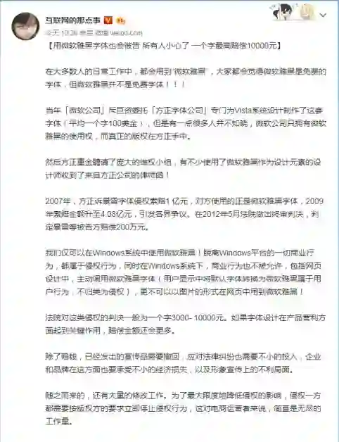 昨天一张截图将“微软雅黑”推上了微博话题热搜榜,一下子方正、微软雅黑、版权等成为网友们热议的话题。