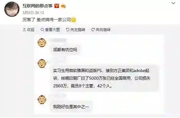 事情开端于知名互联网博主@互联网的那点事 在微博发出截图爆料,有自称某公司的员工称,“实习生用微软雅黑和盗版PS,接到方正集团和adobe起诉,样稿印刷厂印了5000万张已经全国商用,公司损失2860万,裁员8个主管,42个人。自己刚好也是其中之一。”