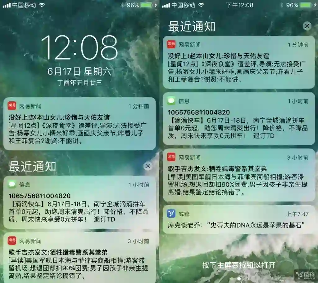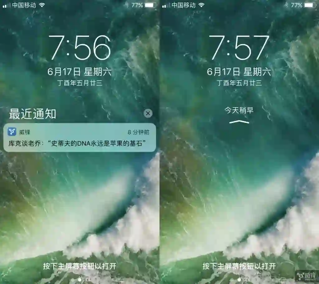 而在锁屏界面下,其主要的变化就是现在也可以向上滑查看最近的通知。另外,现在查看通知不是原本的向右滑动通知浮框了,而是直接轻触或点击就能进入应用中查看。相信锁屏和通知中心的明显调整,对于大多数人来说需要一定的时间去适应。其实我们也可以换句话来说,iOS 11 以特殊的方式支持快速锁屏了,操作方式就是原来下拉通知中心的手势。