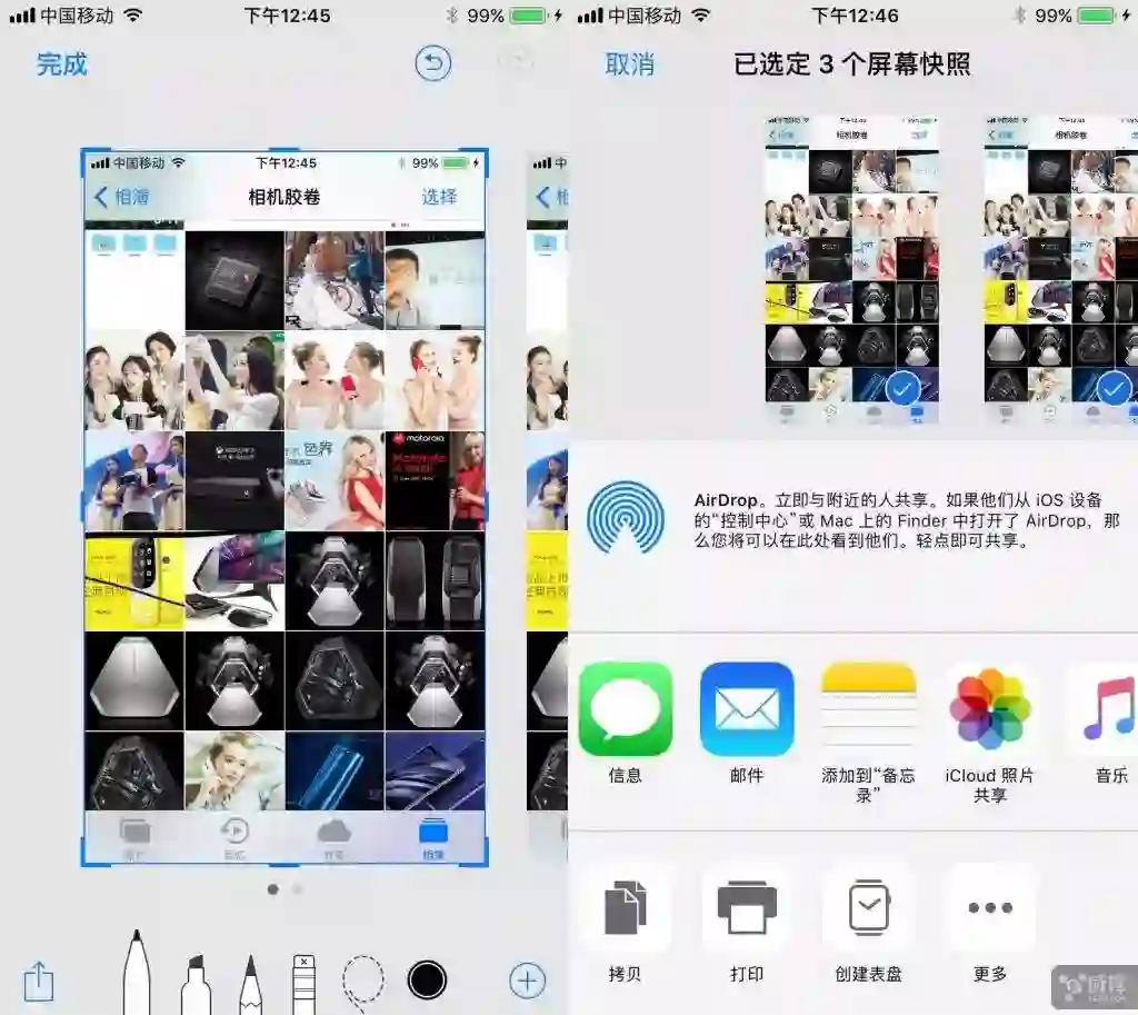 全新的 iOS 11 中,截图做了人性化的改进,不用像之前那样进入相册才能编辑截图了。只要截完图在屏幕左下底部立马出现缩略图(稍等会自动消失),只要点击缩略图就能开始用系统自带编辑功能进行编辑了,包括裁剪、划线、标注等,非常方便。而且如果一次截了很多图,在编辑界面也会显示出多张截图平铺等待编辑,而不是编辑完第一张还要去相册找第二张,确实更加人性化了。