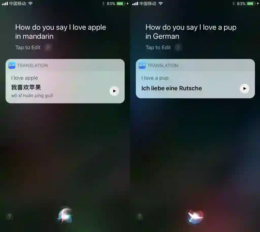 Siri 支持翻译了,可以直接帮你将英文翻译成中文。这点很遗憾,目前在国内还不支持原生中翻英翻译功能,而翻译英文到中文又需要将 Siri 语言设置为美国英语。也就是说,Siri 暂时只能帮你翻译英文成中文、西班牙语、法语、德语或意大利语。另外,毕竟是机器翻译,所以不可能十全十美,能够有目前的水平还算是可以了。