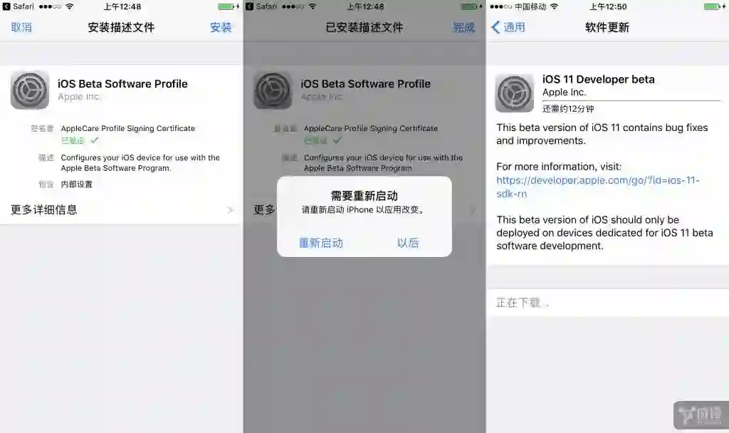首先要说的是,这个 iOS 11 还是开发者测试版本,这就意味着还未完工,在体验中碰到问题也属正常。关于如何升级 iOS 11 开发者测试版就不多说了,个人也是像锋友一样通过配置文件升级,具体方法论坛里有很多。关于安装,iPhone 7 从 iOS 10.3 升级到 iOS 11 速度的确很快,整个过程 10 几分钟左右,比之前升级 10.3 更换文件系统的大更新快多了。