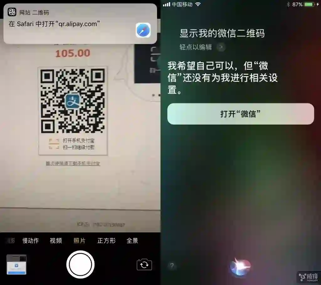 苹果在从 iOS 10 开始就开放 Siri 让第三方应用可整合 Siri,iOS 11 则将 Siri 支持扩展到了更多类别,包括待办事项、备忘录、提醒事项、显示二维码的 app 等。现在你对着 Siri 说“扫描二维码”,摄像头便会立即启动。