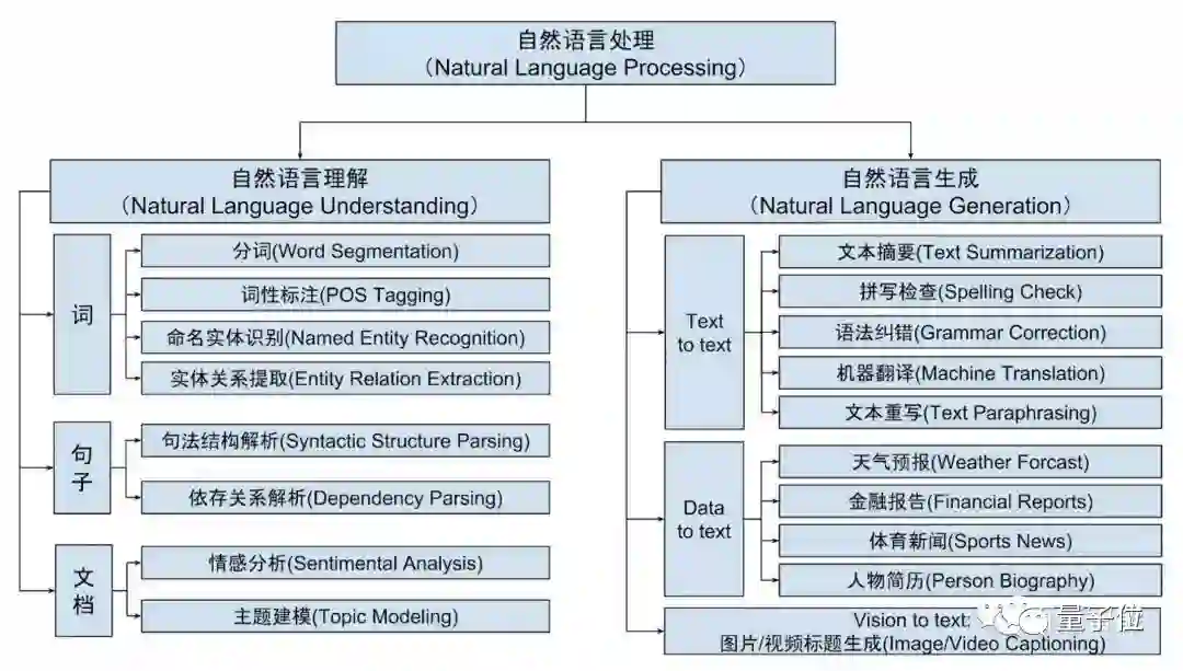 NLP 包含自然语言理解 (Natural Language Understanding,NLU) 和自然语言生成(Natural Langauge Generation, NLG)两个重要方向,如下图所示。