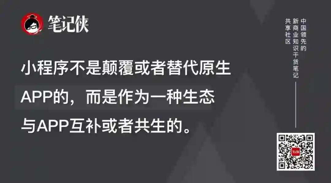 当然,小程序不是颠覆或者替代原生APP的,而是作为一种生态与APP互补或者共生的。