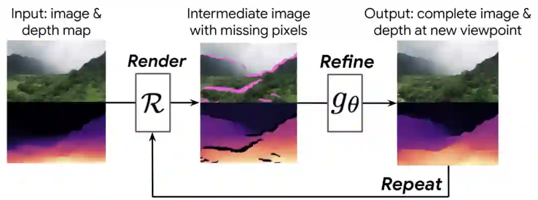 给定一个起始视图,该研究首先要使用单图像深度预测方法计算深度图,然后再使用该深度图将图像向前渲染到新的相机视点,从新视点生成新图像和深度图。