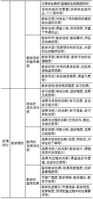 (5)对于成果评价,专家们一致认同以“教学绩效”作为一级指标,并用“学生发展”“教师发展”“教学整体效果”三个二级指标来反映目标达成、存在问题和促进成长的目的。依据成果评价的内容以及“绩”和“效”相结合的原则,70%的专家认为可以从“教学结果”“结果与教学目标的关联性”“结果与教学投入的关联性”“结果与教学过程的关联性”“教学效果的价值与意义”“可推广程度”“教学改革意见”等方面来设定第三级指标。