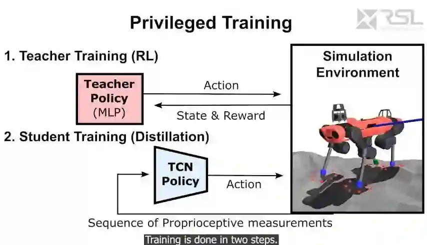 实现优化结果的第二个关键在于特权学习(privileged learning),研究人员发现直接通过强化学习训练出的越野运动策略并不成功:控制信号稀疏,并且所输出的网络无法在合理的时间内学习出正确的运动。新的模型在训练中分为两个阶段,首先训练教师策略,该策略可访问特权信息——真实情况(ground-truth)及机器人接触的情况,随后教师指导纯本体感受的学生控制器学习,后者仅使用机器人本身可用的传感器信息。