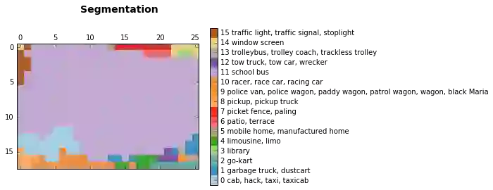 我们得到的结果显示网络模型确实可以从图片中找到校车,以及左上角显示不太清晰的交通标志。而且,模型可以找到左上角建筑物的窗户,甚至猜测说这是一个图书馆(我们无法判断是否属实)。它做出了一些不那么正确的预测。这些通常是由于网络在预测的时候只能看到当前像素周围的一部分图像。网络模型表现出来的这种特性被称为感受视野。在本文中,我们使用的网络模型的感受视野是404像素。所以,当网络只能观察到校车的一部分图片时,与出租车和皮卡车混淆了。