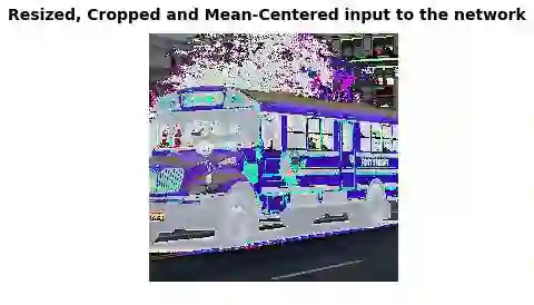 plt.suptitle("Resized, Cropped and Mean-Centered input to network",