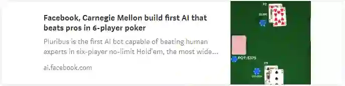 来自Facebook Research上的帖子:“ Pluribus是第一款能够以六人无限注德州扑克打败人类专家的AI机器人,德州扑克是世界上使用最广泛的扑克形式。而且,这是AI机器人第一次在超过两个或两个团队的复杂游戏中击败顶级人类玩家。