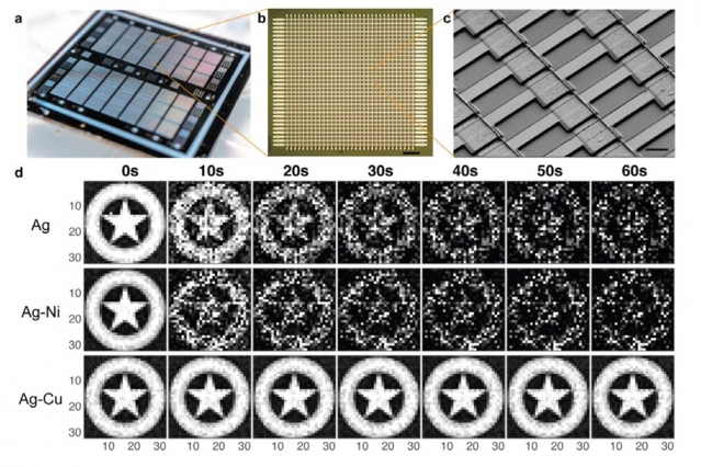 工程师通常使用银作为忆阻器正极的材料。Kim 说:“传统上,冶金学家试图在大块基质中加入不同的原子来强化材料,我们想,为什么不调整忆阻器中的原子相互作用,加入一些合金元素来控制介质中离子的运动。”