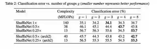 表2 中的结果显示在不同的计算复杂度下,ShuffleNet 始终大大优于其他网络。