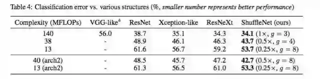 作者使用一样的整体网络布局,在保持计算复杂度的同时将 ShuffleNet 结构单元分别替换为 VGG-like、ResNet、Xception-like 和 ResNeXt 中的结构单元,使用完全一样训练方法。