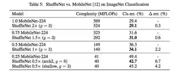 最近 Howard et al. 提出了 MobileNets [4],利用[1]里的逐通道卷积的设计移动设备上高效的网络结构。虽然 ShuffleNet 是为了小于 150 MFLOPs 的模型设计的,在增大到 MobileNet 的 500~600 MFLOPs 量级,依然优于 MobileNet。而在 40 MFLOPs 量级,ShuffleNet 比 MobileNet 错误率低 6.7%。详细结果可以从表3中得到。