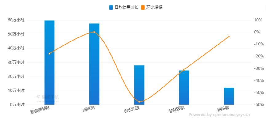 在母婴综合社区日均使用时长上,宝宝树孕育和妈妈网以绝对优势分列前两名,而除妈妈网日均使用时长略有增长外,其他头部App均出现了一定环比下降,宝宝知道更是环比下降57.6%。