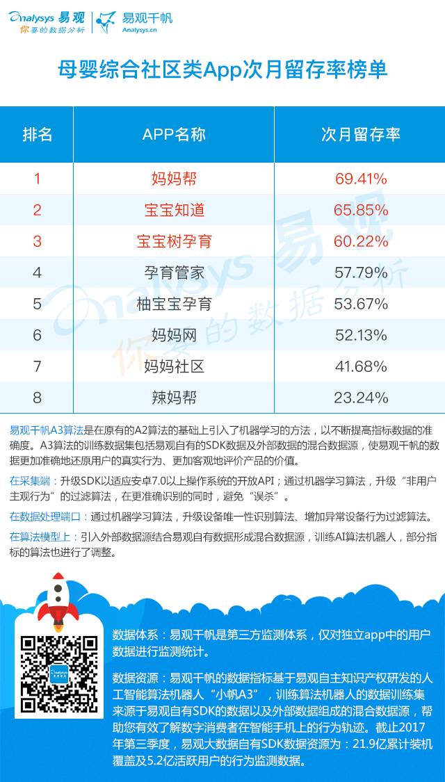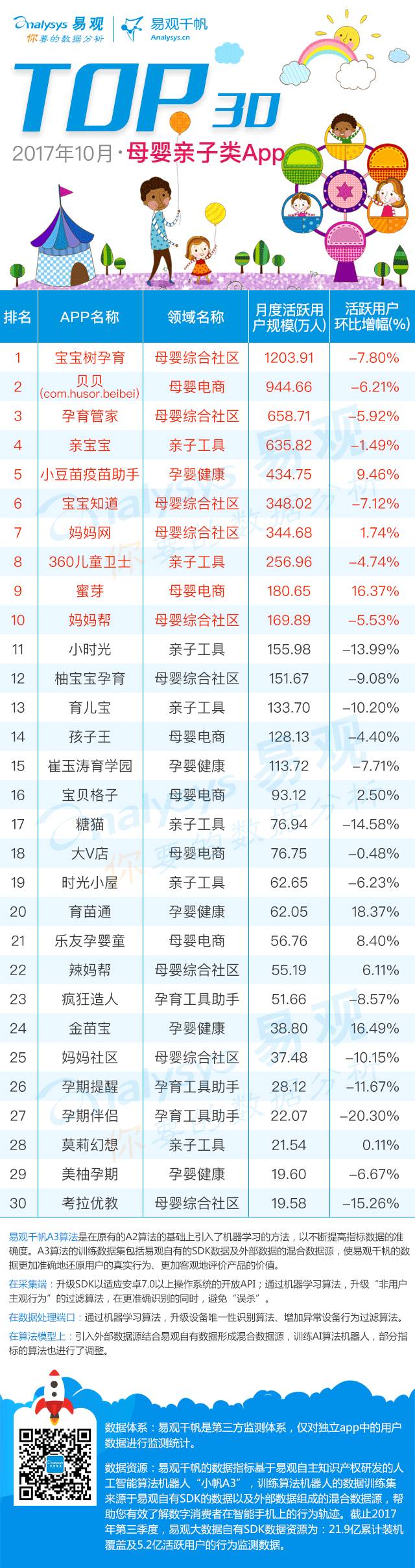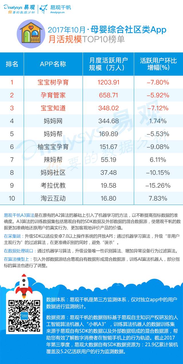 基于易观千帆10月移动应用大数据,我们从母婴亲子类App中,选取母婴综合社区与亲子工具领域运营数据独家发布,根据月度活跃用户规模、人均行为及次月留存率来编制排行榜单和分析解读。
