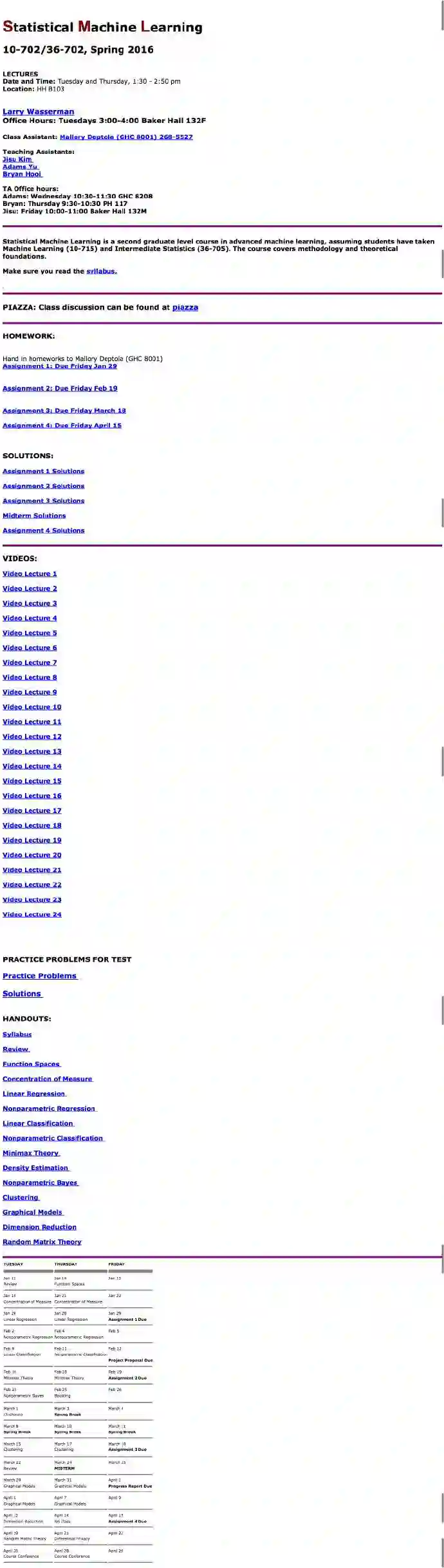 卡内基梅隆大学的《统计机器学习》2016年春季课程。统计机器学习是先进的机器学习的第2门研究生课程,假定学生已经修了机器学习(10-715)和中间统计(36-705)课程。课程内容包括方法论和理论基础。