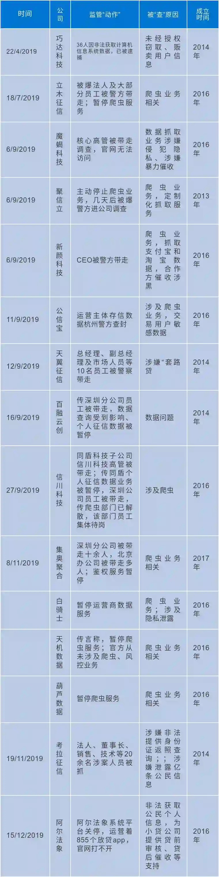 9 月 6 日,大数据智能风控服务供应商魔蝎数据被警方调查,一位核心高管被带走,官网至今无法正常访问;另一家大数据公司新颜科技的 CEO 黄向前也在同一天被警方带走调查;这天,聚信立发通知主动停止了爬虫业务,然未能幸免于“难“,仅过了几天后,聚信立被爆有警方进驻公司调查;9 月 11 日,知名币圈项目公信宝运营主体被杭州警方查封;次日,有媒体报道,集奥聚合深圳分公司十余人被带走,北京办公室也有多人被深圳警方带走;另有爆料称,天翼征信的总经理、副总经理及市场人员被警察带走。