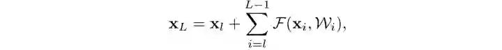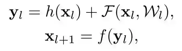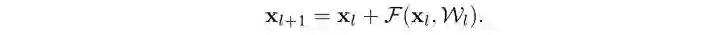 原始的残差公式是这样子的,函数F表示一个残差函数,函数f表示激活函数,: