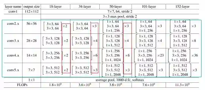中间卷积部分主要是下图中的蓝框部分,通过3*3卷积的堆叠来实现信息的提取。红框中的[2, 2, 2, 2]和[3, 4, 6, 3]等则代表了bolck的重复堆叠次数。