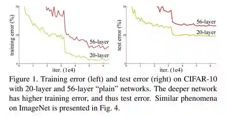 文中给出的实验结果进一步描述了这种退化问题:当传统神经网络的层数从20增加为56时,网络的训练误差和测试误差均出现了明显的增长,也就是说,网络的性能随着深度的增加出现了明显的退化。ResNet就是为了解决这种退化问题而诞生的。
