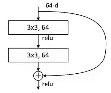 下面我们来具体看一下一个残差块是怎么实现的,如下图所示的basic-block,输入数据分成两条路,一条路经过两个3*3卷积,另一条路直接短接,二者相加经过relu输出,十分简单。