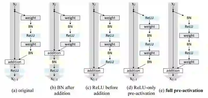 原始的resnet是上图中的a的模式,我们可以看到相加后需要进入ReLU做一个非线性激活,这里一个改进就是砍掉了这个非线性激活,不难理解,如果将ReLU放在原先的位置,那么残差块输出永远是非负的,这制约了模型的表达能力,因此我们需要做一些调整,我们将这个ReLU移入了残差块内部,也就是图e的模式。这里的细节比较多,建议直接阅读原文:https://arxiv.org/abs/1603.05027,就先介绍这么多。